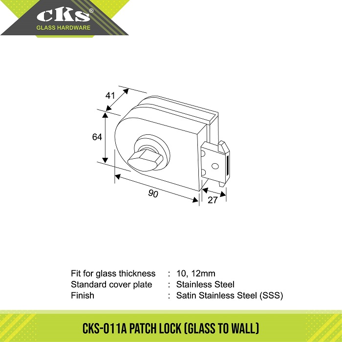 CKS-011A LATCH Latch Category: Locks Description Description Fit for glass thickness : 10, 12mm Standard cover plate : Stainless Steel Finish : Satin Stainless Steel (PSS) Related products CKS-011 & 011K PATCH LOCK & STRIKE BOX Read more CKS-032 LATCH Read more CKS-50RD PATCH LOCK Read more CKS-034 & 034K PATCH LOCK & STRIKE BOX Read more