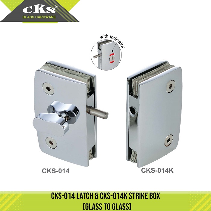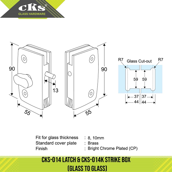 CKS-014 & 014K LATCH & STRIKE BOX Latch / Strike Box Category: Locks Description Description Fit for glass thickness : 8, 10mm Material : Brass Finish : Bright Chrome Plated (CP) Related products CKS-012A PATCH LOCK Read more CKS-034 PATCH LOCK Read more CKS-007 & 007K PATCH LOCK & STRIKE BOX Read more CKS-016 & 016K(L) LATCH & STRIKE Read more