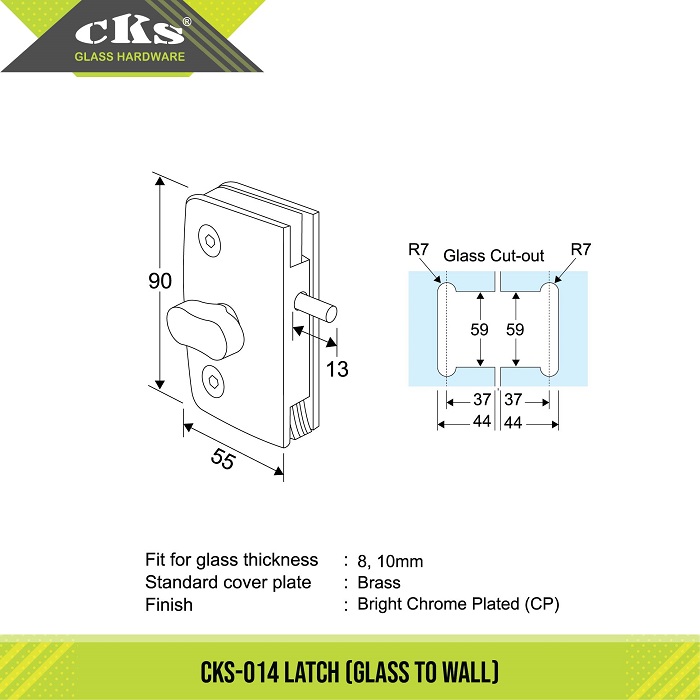 CKS-014 LATCH Latch Category: Locks Description Description Fit for glass thickness : 8, 10mm Material : Brass Finish : Bright Chrome Plated (CP) Related products CKS-007 & 007K PATCH LOCK & STRIKE BOX Read more CKS-011 & 011K PATCH LOCK & STRIKE BOX Read more CKS-50S/CL CENTRE PATCH LOCK Read more CKS-50R PATCH LOCK Read more