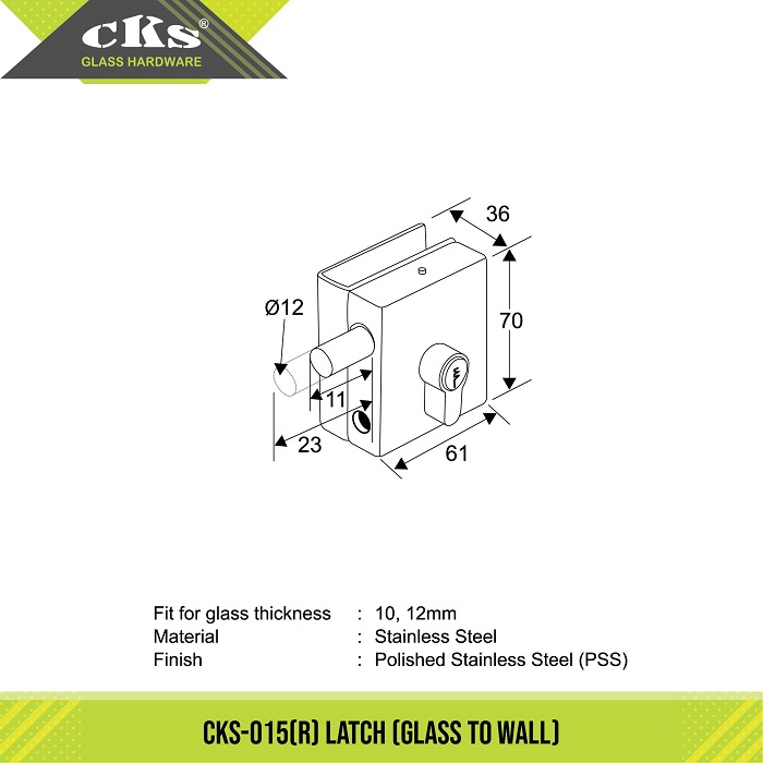 CKS-015(R) LATCH Latch Category: Locks Description Description Fit for glass thickness : 10, 12mm Material : Stainless Steel Finish : Polished Stainless Steel (PPS) Related products CKS-50K CENTRE STRIKE BOX Read more CKS-007 PATCH LOCK Read more CKS-035 PATCH LOCK Read more CKS-018 & 018K LATCH & STRIKE Read more