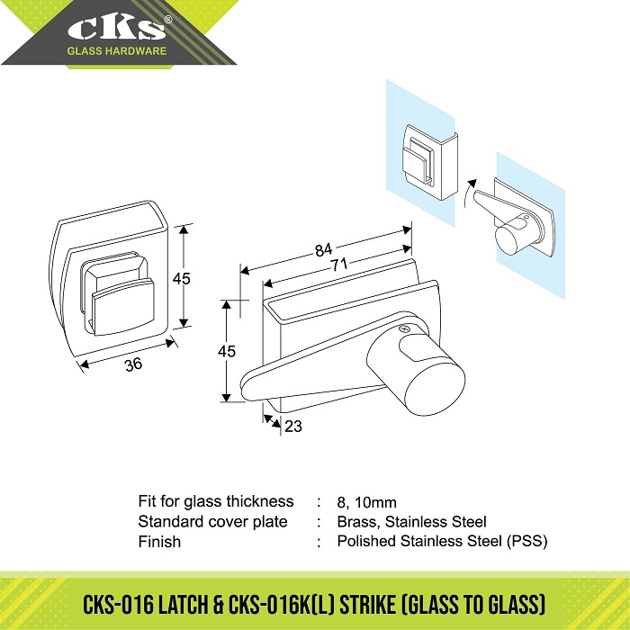 CKS-016 & 016K(L) LATCH & STRIKE Latch / Strike Category: Locks Description Description Fit for glass thickness : 8, 10mm Material : Brass, Stainless Steel Finish : Polished Stainless Steel (PPS) Related products CKS-007 PATCH LOCK Read more CKS-50RD PATCH LOCK Read more CKS-013 & 013K PATCH LOCK & STRIKE BOX Read more CKS-014 LATCH Read more
