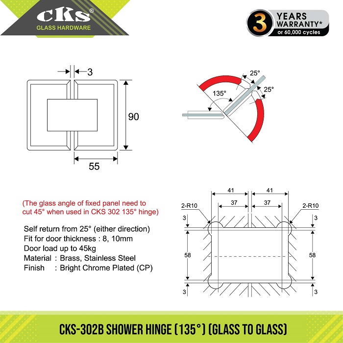 (The glass angle of fixed panel need to cut 45° when used in CKS 302 135° hinge)