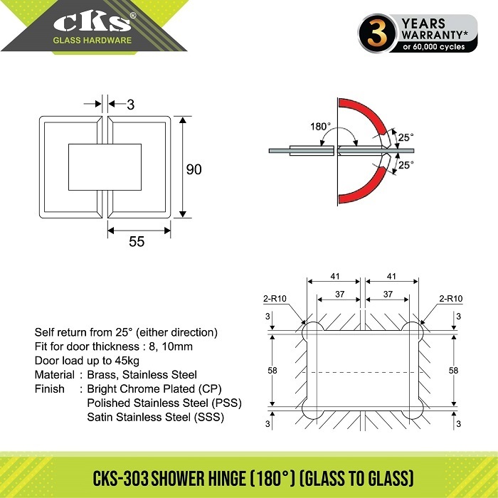 (The glass angle of fixed panel need to cut 45° when used in CKS 302 135° hinge)