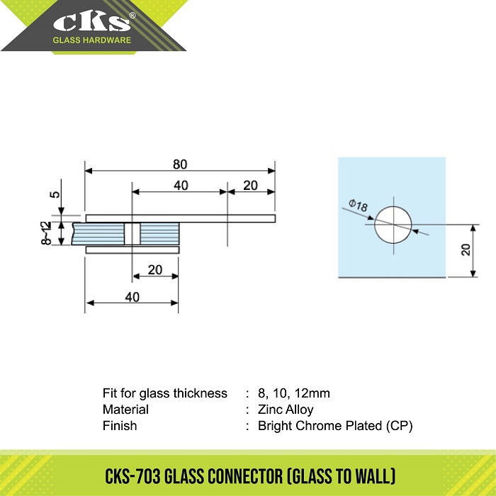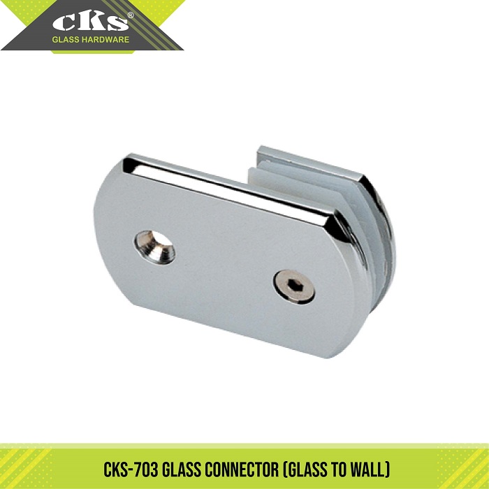 CKS-703 GLASS CONNECTOR Glass To Wall Category: Glass Connector Description Description Fit for glass thickness 8, 10, 12mm Material Zinc Alloy Finish Bright Chrome Plated (CP) Related products CKS-705 GLASS CONNECTOR Read more CKS-701 GLASS CONNECTOR Read more CKS-724 GLASS CONNECTOR Read more CKS-721 GLASS CONNECTOR Read more