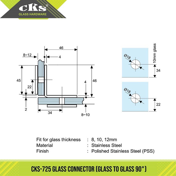 CKS-725 GLASS CONNECTOR Glass To Glass (90°) Category: Glass Connector Description Description Fit for glass thickness 8, 10, 12mm Material Stainless Steel Finish Polished Stainless Steel (PSS) Related products CKS-706 GLASS CONNECTOR Read more CKS-726 GLASS CONNECTOR Read more CKS-723 GLASS CONNECTOR Read more CKS-721 GLASS CONNECTOR Read more