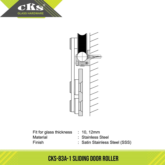 CKS-83A-1 SLIDING DOOR ROLLER Sliding door roller CKS-83A-1 ROLLER WARRANTY LETTER Category: CKS-83A Series Sliding Door System Description Description Fit for glass thickness : 10,12mm Material : Stainless Steel Finish : Satin Stainless Steel (SSS) Related products CKS-83A-7 WALL CONNECTOR FOR TRACK Read more CKS-83A-6 FIXED FITTING Read more CKS-83A-8 END CAP (D25MM) Read more CKS-83A-3 GLASS CONNECTOR FOR TRACK Read more