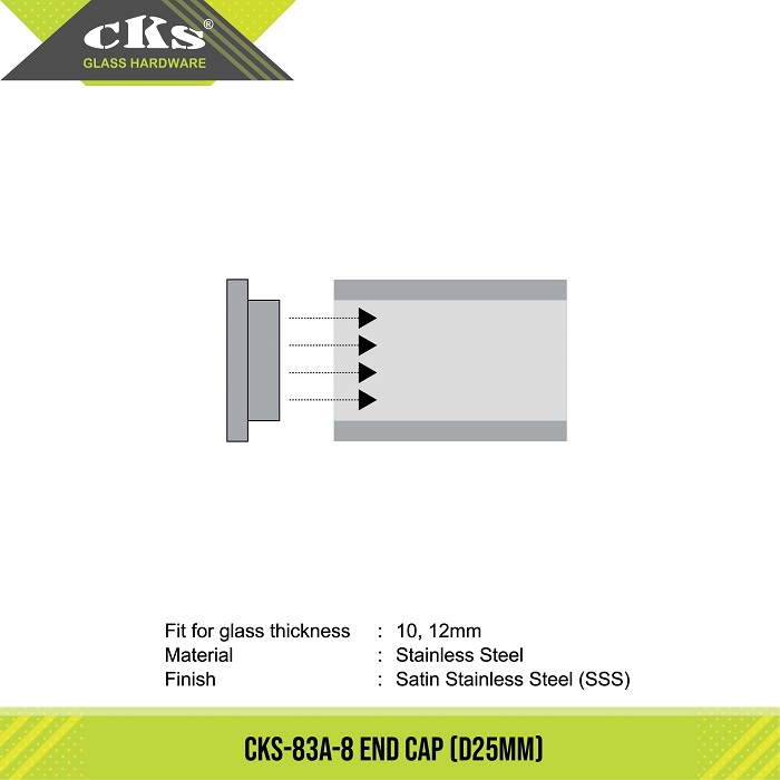 CKS-83A-8 END CAP (D25MM) End Cap ∅25mm Category: CKS-83A Series Sliding Door System Description Description Fit for tube : D25mm Material : Stainless Steel Finish : Satin Stainless Steel (SSS) Related products CKS-83A-5 / 5A FLOOR GUIDE Read more CKS-83A-1 SLIDING DOOR ROLLER Read more CKS-83A-3 GLASS CONNECTOR FOR TRACK Read more CKS-83A-7 WALL CONNECTOR FOR TRACK Read more