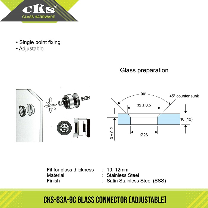 CKS-83A-9C GLASS CONNECTOR Single point fixing. Adjustable. Category: Glass Connector (80A Series) Description Description Fit for glass thickness 10, 12mm Material Stainless Steel Finish Satin Stainless Steel (SSS) Related products CKS-80A-4 GLASS CONNECTOR Read more CKS-80A-1 GLASS CONNECTOR Read more CKS-80A-3 GLASS CONNECTOR Read more CKS-80A-2 GLASS CONNECTOR Read more