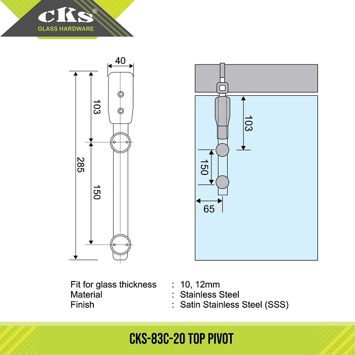 CKS-83C-20 TOP PIVOT Top pivot Category: Pivot Door System Description Description Fit for glass thickness : 10, 12mm Material : Stainless Steel Finish : Satin Stainless Steel (SSS) Related products CKS-83C-40S SIDEPANEL TO OVERPANEL Read more CKS-83C-10 BOTTOM PIVOT Read more CKS-83C-40 SIDEPANEL TO OVERPANEL PIVOT Read more CKS-83C-30 WALL TO OVERPANEL PIVOT Read more