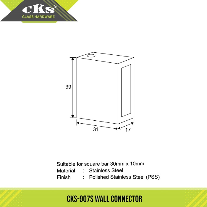 CKS-907S WALL CONNECTOR Category: Shower Stabilizer Description Description Fit for glass thickness 8-12mm Material Stainless Steel Finish Polished Stainless Steel (PSS) Related products CKS-914A END CONNECTOR Read more CKS-T19 (1.0MM) D19MM STAINLESS STEEL TUBE Read more CKS-901 TUBE TO TUBE CONNECTOR Read more CKS-T3010 (1.5MM) SQUARE BAR Read more