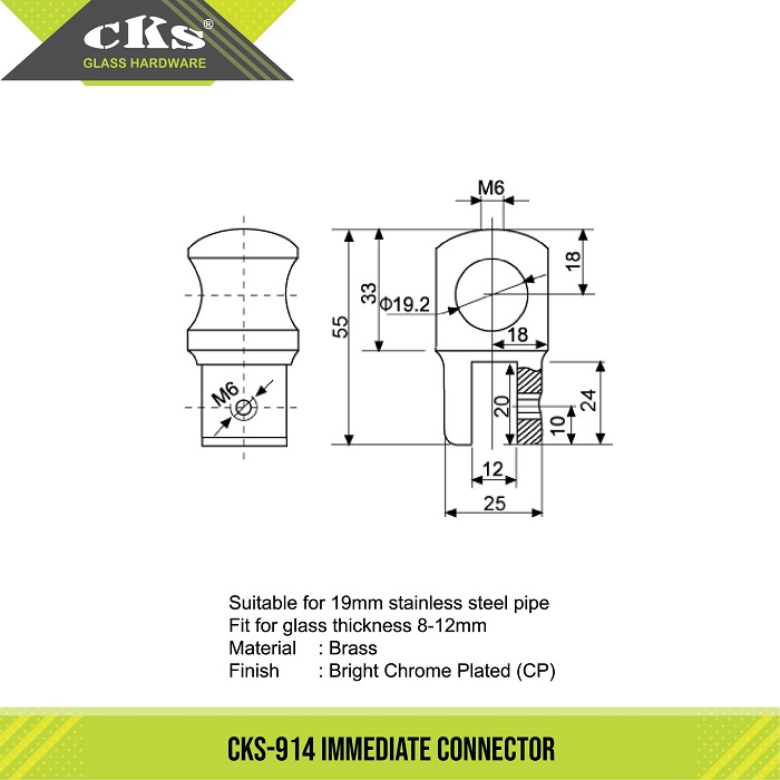 CKS-914 IMMEDIATE CONNECTOR Category: Shower Stabilizer Description Description Suitable for 19mm stainless steel pipe Fit for glass thickness 8-12mm Material Brass Finish Bright Chrome Plated (CP) Related products CKS-T3010 (1.5MM) SQUARE BAR Read more CKS-902 THREE POINT CONNECTOR 90′ Read more CKS-907 WALL CONNECTOR Read more CKS-915 ADJUSTABLE ANGULAR CONNECTOR Read more