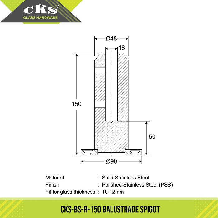 CKS-BS-R-150 BALUSTRADE SPIGOT Category: Balustrade Spigots Description Description Material : Solid Stainless Steel Finish : Polished Stainless Steel (PSS) Fit for glass thickness : 10-12mm Maximum Frameless Glass Panel Dimension for Balustrade Spigots Related products CKS-AR004 ALUMINIUM RAILING (3.0M) Read more CKS-BS-S-220 BALUSTRADE SPIGOT Read more
