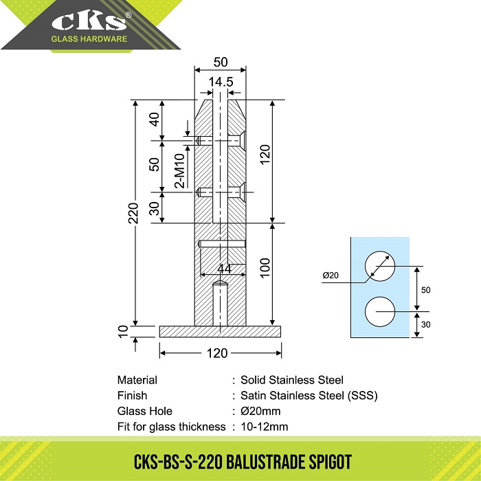 CKS-BS-S-220 BALUSTRADE SPIGOT Category: Balustrade Spigots Description Description Material : Solid Stainless Steel Finish : Satin Stainless Steel (SSS) Glass Hole : Ø20mm Fit for glass thickess : 10-12mm Maximum Frameless Glass Panel Dimension for Balustrade Spigots Related products CKS-BS-R-150 BALUSTRADE SPIGOT Read more CKS-AR004 ALUMINIUM RAILING (3.0M) Read more