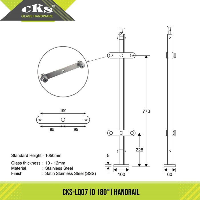 CKS-LQ07 (D 180′) HANDRAIL Category: Handrail Series Description Description Standard Height : 1050mm Material : Stainless Steel Finish : Satin Stainless Steel (SSS) Maximum Frameless Glass Panel Dimension for Handrail (CKS-LQ 07) Related products CKS-LQ01(90′) HANDRAIL Read more CKS-LQ SS SINGLE SIDE CONNECTOR Read more CKS-LQ GC GLASS CONNECTOR Read more CKS-LQ01(S) HANDRAIL Read more