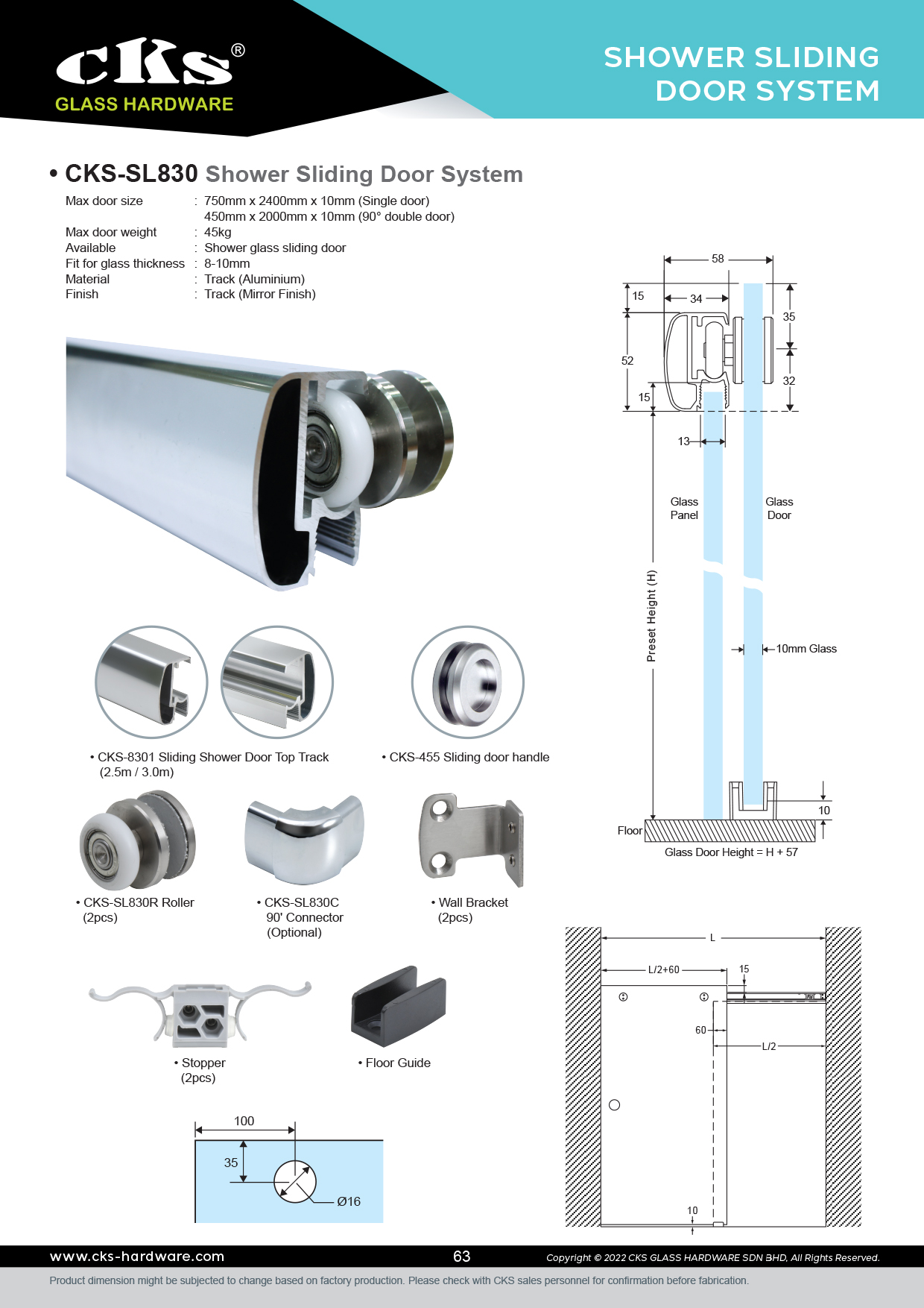 CKS-SL830 SHOWER SLIDING DOOR SYSTEM Category: CKS-SL830 Shower Sliding Door System Description Description Max door size : : 750mm x 2400mm x 10mm (single door) 450mm x 2000mm x 10mm (90° double door) Max door weight : 45kg Available : Shower Glass Sliding Door Fit for glass thickness : 8 – 10mm Material : Aluminium Finish : Mirror Finish
